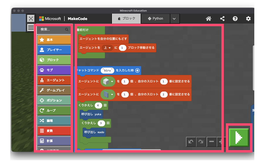 マインクラフト教育版のプログラミングと同様に、ブロックを組み合わせてプログラムを作成します。